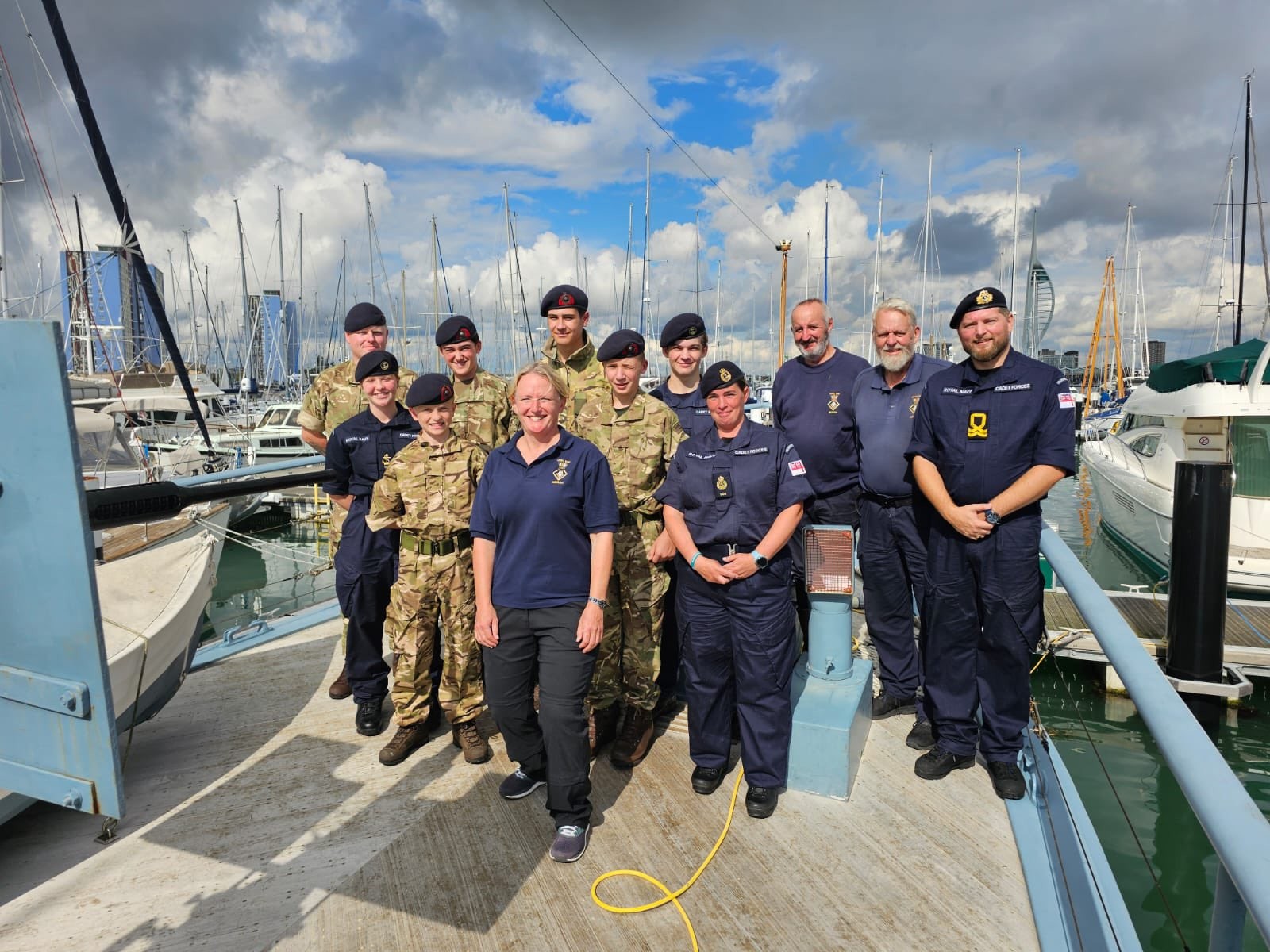 Cadets, staff, CFHT Trustees and the Navy’s Director of People and Training, Rear Admiral Jude Terry onboard HMS Medusa, a Harbour Defence Motor Launch that saw action on D Day off Omaha Beach