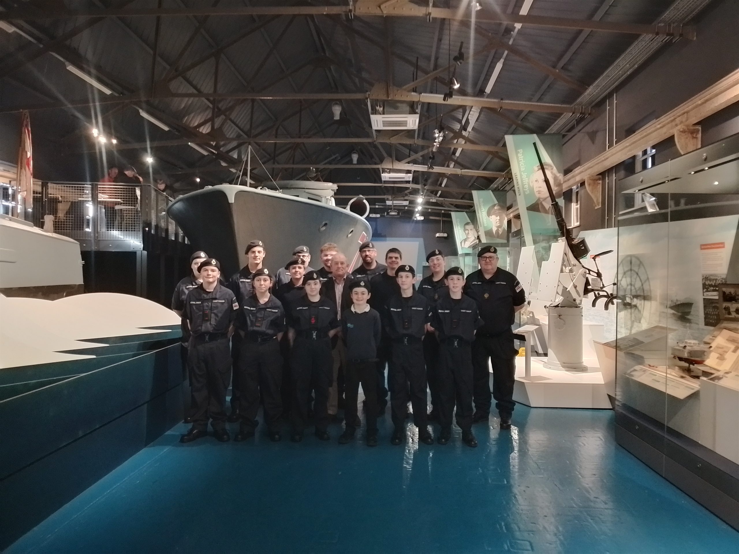 Cadets, staff, CFHT Trustees and the Navy’s Director of People and Training, Rear Admiral Jude Terry onboard HMS Medusa, a Harbour Defence Motor Launch that saw action on D Day off Omaha Beach