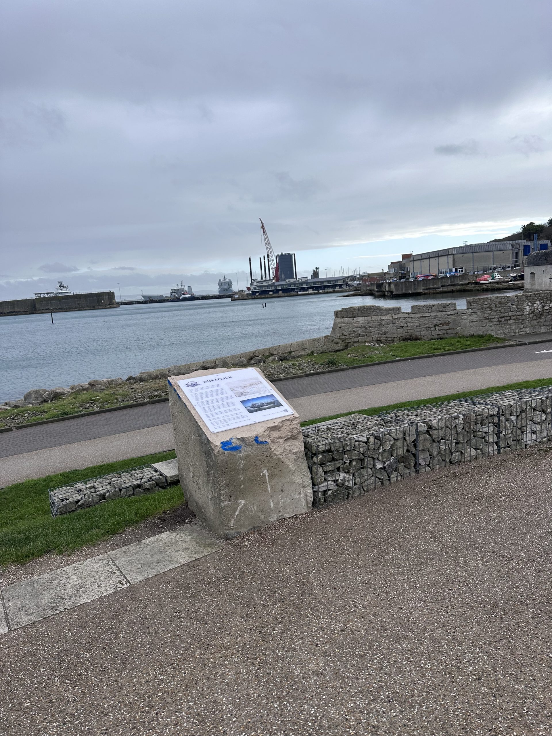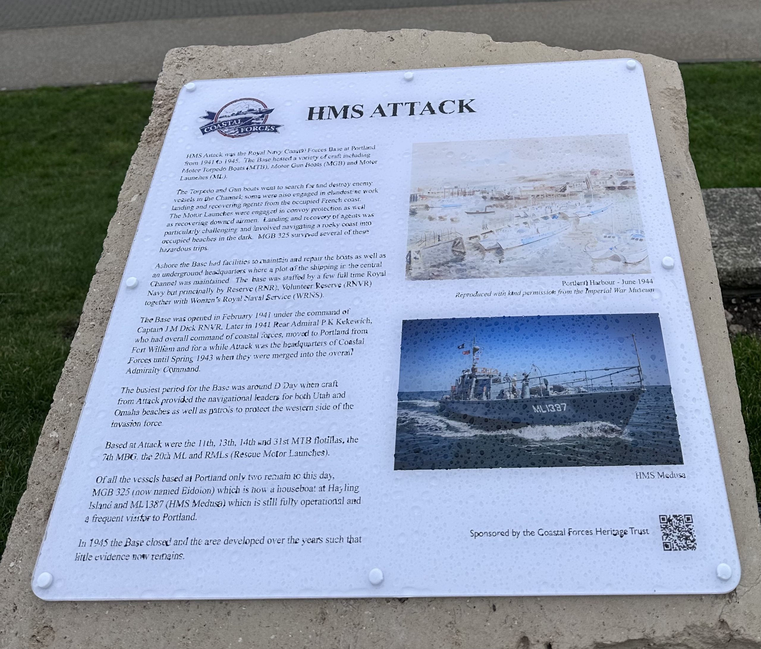 These three images are of the new memorial plaque to HMS Attack at Portland. The original (see below) is still in place but very difficult to access. As you can see, the new plaque is close to where the RNSA Portland runway was… The blue markings are related to the stonecutting and should wash off very quickly in the January weather!